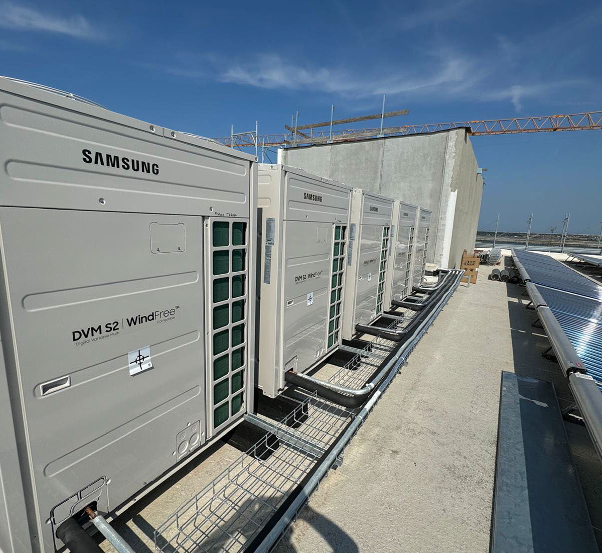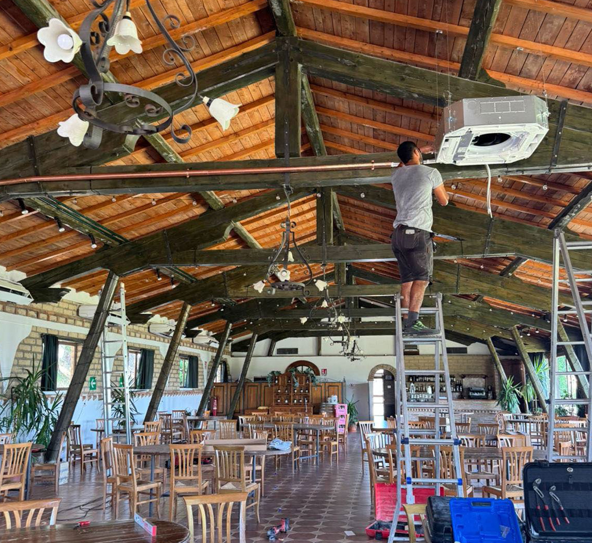 Abbiamo realizzato un impianto di climatizzazione per una veranda in vetro e legno, destinata a una sala di degustazione di vino a Montalcino. L’obiettivo era garantire il massimo comfort climatico preservando l'estetica dell’ambiente, molto importante per il cliente, un artista attento ai dettagli. Per soddisfare le esigenze estetiche e funzionali, è stata scelta l'unità "seta 360", che sarà rivestita per integrarsi armoniosamente nello spazio, mantenendo un impatto visivo minimale e elegante.